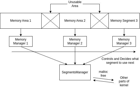 So, this is my plan. One "SegmentsManager" manages memory manager that controls one contiguous memory area, and the contiguous memory areas are all managed by sub-memory managers. I'm sure you'll understand everything when I implement this. It's just like the Feudalism lol. I'm kinda concerning that implementation of this might be little bit hard, but (well) we'll never know before actually doing it!