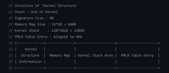 Also, I cleaned up some messes of kernel's memory structure. Basically, I came up with "Kernel Structure" that bootloader is obligated to make. The bootloader sends basic information about kernel(such as location of stack, or location of memory map) via function argument when calling the final state kernel function.