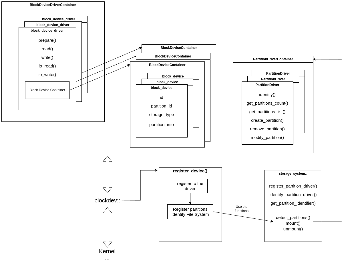 As you can see on the diagram, the BlockDeviceDriverContainer contains all the block device drivers in the kernel system. The driver has a container that has the devices dependent to the driver(= devices that uses the driver.) Upon registering the device, the partition is automatically detected, and the storage system automatically registers logical devices which also contained in the parent physical device.