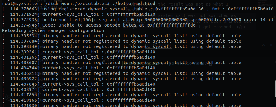 To see whether the bprm contains the proper syscall ptr, I dumped the system call pointer via printk, and surprisingly the table pointer was 0x00!