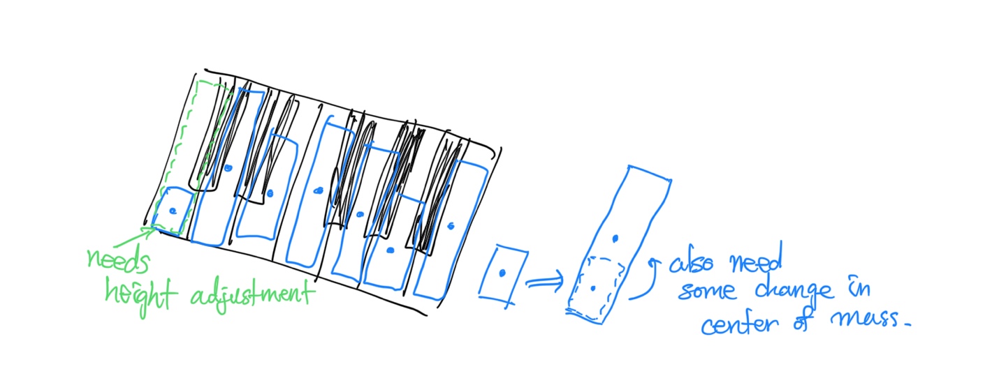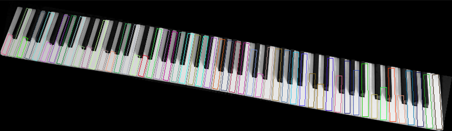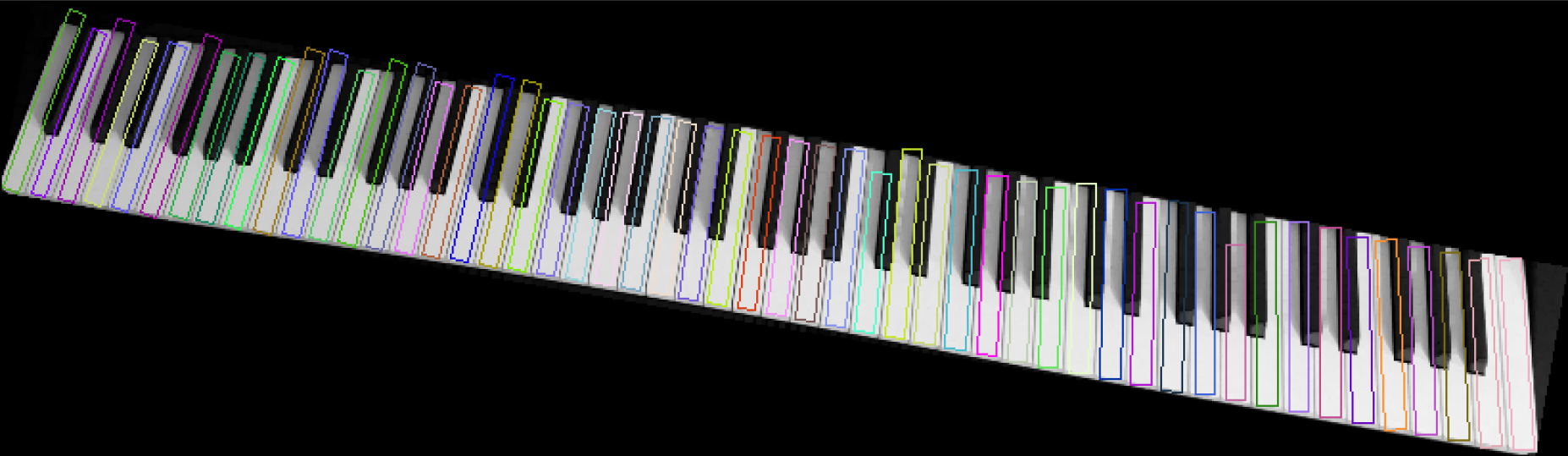 Today I finally finalized the system for white keys. From just a crude approximation of keys' contours, I constructed the bounding box for the contours that properly encloses the area of each keys.