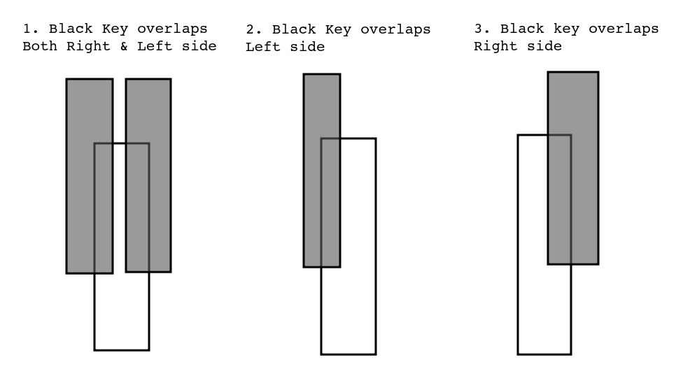 Today I tried to implement the note detection system. The idea is to circulate each white keys and find what black keys overlap with it. By finding the white key's side in which the black keys occupy, we can identify the shape of the white key.
