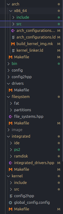 The kernel is compiled in a bit different way than the loader, however. There are separate directories that all contains the kernel sources, which are later all to be linked. Those directories has a bit different structures, mainly differed by their purposes. For core kernel sources, the source files are separated into source and headers. For integrated drivers, unlike core kernel, they are separated by each drivers, as shown in this image :