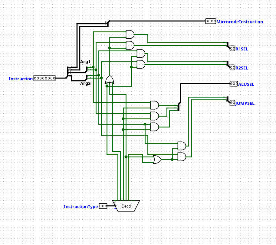 It's just a simple logic circuit that uses AND gates to direct the arguments from the instruction by the given instruction type. I don't know whether this design will work, but we will see.