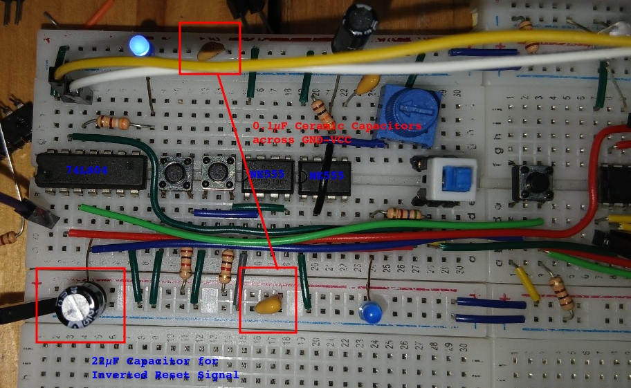 Anyway, just to be extra safe, I added two 0.1μF ceramic capacitor across the VCC and GND, as I felt like the 555's clock signal also creates some interferences in the main VCC and GND line. For the bypass capacitor for inverted reset signal, I used 22μF electrolytic capacitor(to be frank, those values(0.1μF, 22μF) are just utterly arbitrary!)