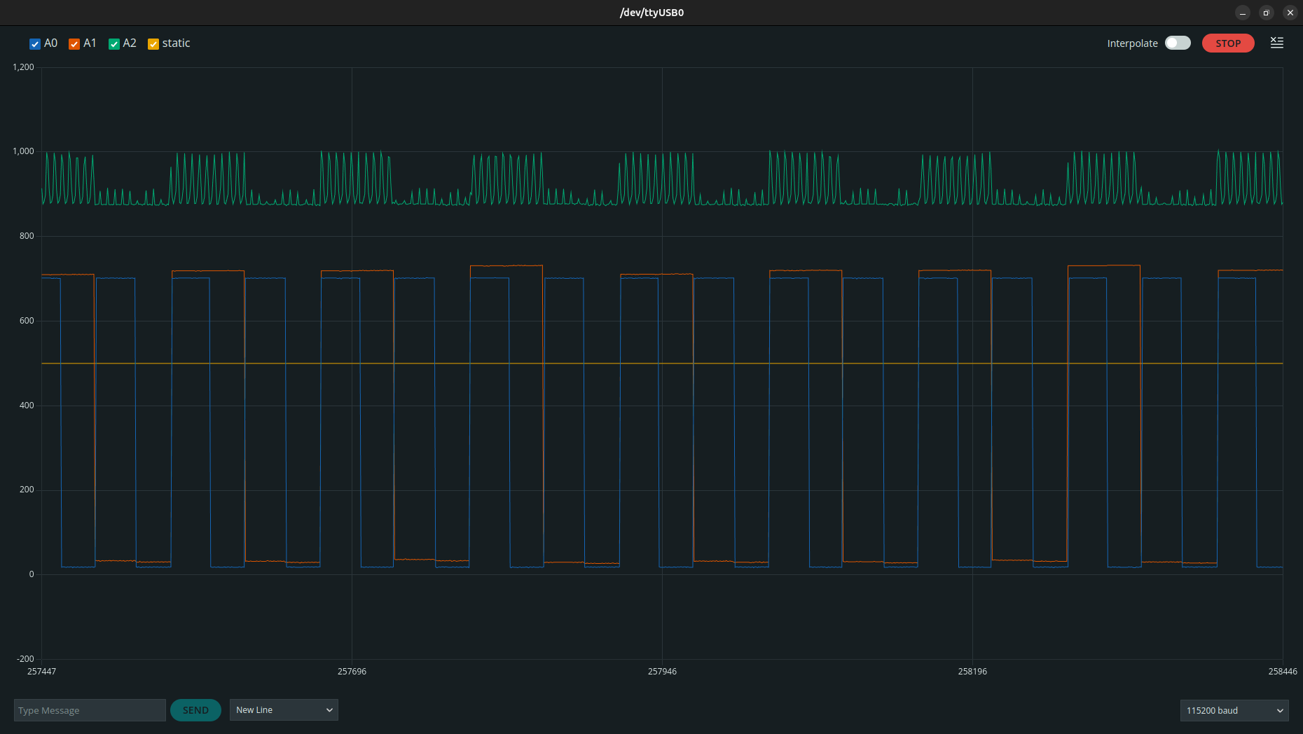 You see, Arduino IDE has quite a useful tool called "Serial Plotter," which graphically plots the data coming from the serial for you, just like the oscilloscope(but with severely scarce functionalities.)